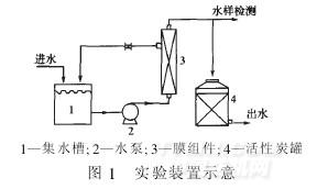 活性炭罐體積為25L,直徑0.25m,高0.4m;膜組件為天津膜天膜公司生產的MOF-503型產品,純水通量2m3/d;水泵為市售蠕動泵,集水槽為25L塑料水桶。
