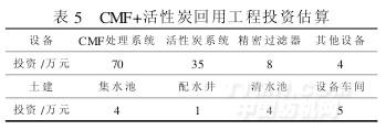 (2)運(yùn)行成本。CMF+活性炭回用處理工藝每噸水運(yùn)行成本:耗電0.20元;換膜費(fèi)0.14元;膜清洗費(fèi)0.03元;活性炭系統(tǒng)維護(hù)費(fèi)0.08元;人工費(fèi)0.02元;系統(tǒng)折舊費(fèi)0.10元;總運(yùn)行成本0.57元。