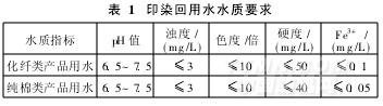 印染廢水的處理與回用研究,應與印染生產實際情況相結合。該企業確立了“分質供水、清污分流”的清潔生產方針,實施染整生產全過程清潔生產。生產廢水清污分流排放,降低了廢水的處理難度;以分質供水方式,將回用水分類回用于不同生產工序,降低了處理成本。該企業生產最大用水量為30000噸/日,規劃回用水量為20000噸/日。二級處理后,出水與自來水源水(河水)混合,進入深度處理。其中,深度處理軟化后,出水直接供應化纖類產品生產用水;深度處理反滲透(RO)膜處理后,出水回用于純棉類產品生產。深度處理軟化前部分工程已建成,并投入運行;RO處理工藝已完成中試。公司化纖類和純棉類產品染色工藝對回用水水質要求見表1。