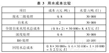 該公司2007年生產總用水量30000噸/日,廢水回用工程全部建成后回用水量20000噸/日,深度處理水總處理量30000噸/日(含水源水10000噸/日)。軟化處理后直接回用20000噸/日,RO處理后回用水10000噸/日,廢水實際回用率為66.7%。回用工程總投資約1500萬元。采用回用水與直接采用自來水的用水成本比較見表3。