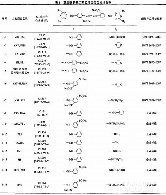 截止到2008年6月底,我圜熒光增白劑產品質量標準已頒布國家級標準l項[HG/T10661—2003,熒光增白劑VBL(表1,1一1)】,化工行業標準13項,即HG/T2555—1993,熒光增白劑DCB(表5,5—1);HG/T 2556—1993,熒光增白劑DT(表3,3—1);HG/T 2590—2000,熒光增白劑ER(330%)(表4,4—1);HG/T 3675—2007,熒光增白劑CXT(表1,1—2);HG/I'3703—2002,熒光增白劑OB—l(表3,3—2);HG/T 3725—2003,熒光增白劑CF一127(表2,2—2);HG/T 3726—2003,熒光增白劑CF一35 l(表2,2—1);HG/T 3727—2003,熒光增白劑BBU(表1,1—5);HG/T3967—2007,熒光增白劑MST—H(表l,1--6);HG/T 3970—2007,熒光增白劑SH(表1。1—4);HG/T 3971—2007,熒光增白劑HST(表1,1一7);HG/T 3990,熒光增白劑BA(表1,1一3);HG/T 4037—2008,熒光增白劑SWN(表6,6—1).這14個熒光增白劑品種數雖只占目前我國生產的熒光增白劑品種總數的46.7%,但其生產量卻占我國熒光增白劑總產量的80%,也就是說目前我國生產的80%熒光增白劑產品都有全國統一的質量標準.這對規范市場、促進我國熒光增白劑行業健康發展、保護消費者的合法權益具有重要意義.這14個熒光增白劑品種基本能滿足我國紡織印染行業各類纖維及混紡織物增白增艷的需要.
