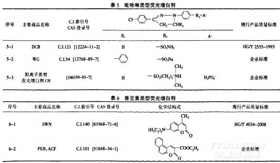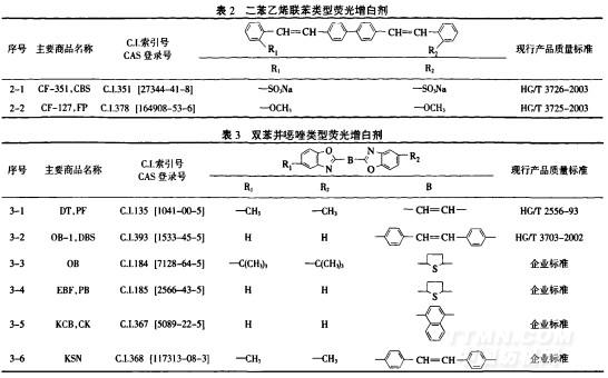 改革開放以來,我國的熒光增白劑工業有了大發展,先后開發出40余個品種的熒光增白劑,它們分屬不同的化學結構類型,適用于不同纖維及其混紡織物和不同增白工藝.目前生產的熒光增白劑品種有30余個,分屬的化學結構類型:①雙三嗪氨基二苯乙烯類型;②二苯乙烯聯苯類型;③雙苯并Ⅱ惡唑類型;④二苯乙烯基苯類型;⑤吡唑啉類型;⑥香豆素類型.表l一表6詳細列出了這些品種各自分屬的化學結構類型及其C.I.索引號、CAS登錄號、化學結構式和產品質量標準[1].
