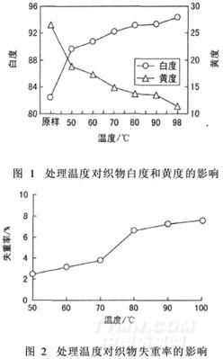 改性茶皂素40g/L,處理時間40min,按1.2.1節工藝,改變溫度處理棉織物,考察處理溫度對織物白度、黃度和失重率的影響,結果見圖1和圖2。