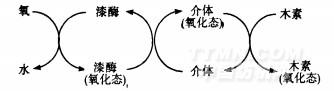 漆酶能夠在分子氧條件下催化很多酚型和芳香胺型化合物的氧化反應.[6]66酌通過加入小分子介體物質如ABTS[2,2-連氮-雙(3-乙基苯并噻唑-6-磺酸)]或HBT(1-羥基苯并三唑)可以將底物范圍擴大到非酚型木素結構單元.目前,漆酶/介體系統(LMS)已成功應用于木漿的漂白.[17]介體在酶的作用下會形成活性高且有一定穩定性的中間體,中間體能夠從氧分子中獲得電子傳遞給木素分子使木素降解,脫除木素,達到漂白目的.其簡單的催化循環過程如下: