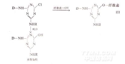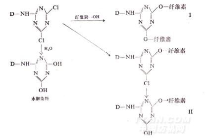 與此同時(shí),未被纖維吸著而留在水中的染料,不可避免地要與水發(fā)生作用,即染料的水解作用。水解染料失去反應(yīng)能力,不再被纖維固著。反應(yīng)式如下: