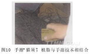 目前比較流行的手擦“貓須”洗水方法就是植脂與手擦兩種方法相結合。一般是先將牛仔褲某部位弄褶皺后,加入樹脂漿料使之定形硬挺,然后用砂紙或刀片磨花褶皺的折邊處,再進行退漿洗水(10),這種效果自然并富有隨意感。當然,也有廠家將褲子套在有凹凸“貓須”紋樣的模型板上,直接用磨輪打磨凸出部分,形成須紋,此法簡便快捷,但磨出的效果比較統一,缺少變化,深淺效果比較難控制。
