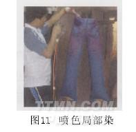噴藥劑即著色處理。分為浸色全染和噴色局部染。浸色全染又稱成衣套染,是指將經過褪色、石磨洗的牛仔成衣再添染其它色彩,以追求鮮艷、時尚的色彩流行趨勢。噴色局部染是目前比較流行的后整理方法之一,首先吹脹褲子并吊掛固定,然后將藥液噴射到褲子某個局部的表面,使牛仔褲達到預期效果,如噴馬騮。噴色局部染見圖11。