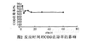 調節活性艷紅模擬廢水的pH值在最佳pH值附近,其它反應條件不變,避光反應2~60min不同的時間,出水COD去除率如圖2。