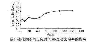 由圖5可以看出,隨著反應時間的增加,COD的去處率逐漸增大,但是增加的幅度不是很大,反應時間為90min時,去除率達到了80%以上,故確定反應時間為90min。