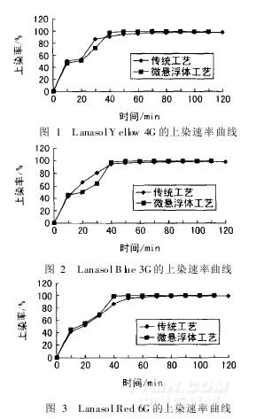 根據(jù)各自的最佳工藝條件,上述三種染料分別按傳統(tǒng)染色工藝和微懸浮體染色工藝對羊毛纖維進(jìn)行染色,兩種工藝下的上染速率曲線如圖1~3所示。