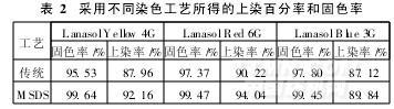 分別采用傳統(tǒng)染色工藝和微懸浮體染色工藝在各自最佳工藝條件下對羊毛纖維進(jìn)行染色,測定其上染百分率和固色率,結(jié)果如表2所示。