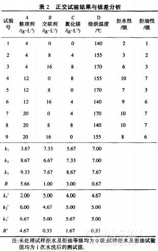 由表2可知,對滌綸織物拒水性能而言,各因素極差由大到小排列為:RA>Rc>RB>RD。對拒油性能為:R,A>R,C>R,B=R,D整理劑FG一410用量是最主要的影響因素,因此,在確定其水平數時一定要選擇整理效果最佳的水平.選擇A3水平(20g/L)可使整理后滌綸織物拒水拒油等級同時達到最好;而MgCl2用量是影響整理后滌綸織物拒水拒油等級的次重要因素,選擇C3水平(8g/L)可使整理后滌綸織物拒水拒油等級同時達到最好;因正交試驗只測試了整理后滌綸織物1次水洗后的拒水拒油性能,尚不能全面反映交聯劑的作用,所以,交聯劑用量的最優水平通過后續耐洗性能測試后再確定.焙烘溫度對織物的拒水拒油效果影響較小,結合拒水拒油整理效果及生產成本,選擇D2水平(155℃).