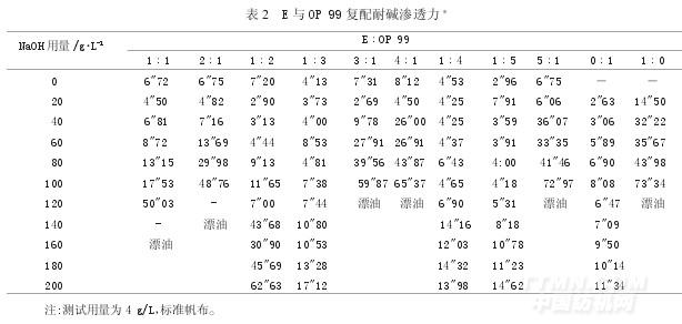 從表2測試數(shù)據(jù)可看出,隨著OP99在復(fù)配體系里的比例增大,耐堿滲透力表現(xiàn)的數(shù)值很好,但是它的泡沫也隨之增大。結(jié)合泡沫實驗數(shù)據(jù),確定了3∶1體系的耐堿滲透力和低泡沫為最佳值。以此比例與其他表面活性劑混配精練劑。