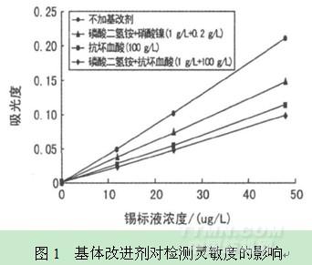 為消除樣品中復雜基體對待測元素測定結果產生的干擾,基體改進劑已廣泛應用于石墨爐原子吸收法[3]。錫在測定過程中易形成揮發性的化合物,因此必須選擇一種合適的基體改進劑,消除基體干擾,從而提高測定靈敏度。文獻報道[4-6]的基體改進劑有磷酸二氫銨、抗壞血酸、硝酸鎳、硝酸鉀、硝酸鈣和硝酸鈀等。移取消解樣品(還原藍20)10mL于25mL容量瓶中,分別加入標樣至12,24,48μg/L,定容,其中消解樣品中錫含量未檢出,忽略不計,以下同。灰化溫度和原子化溫度參考瓦里安用戶手冊,分別選用800℃和2600℃。選用幾種常用的基體改進劑,考察其對錫標準溶液吸光度的影響,結果見圖1。