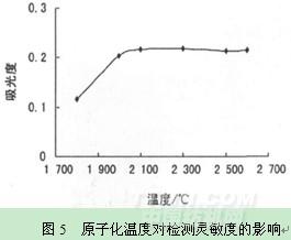 如圖5所示,溫度大于2100℃時,信號趨于穩定,但2100℃時峰形較差,有拖尾,故選擇原子化溫度2300℃。