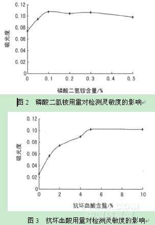 如圖2所示,磷酸二氫銨用量大于0.1%時,吸光度趨于穩定;但隨著其用量增大,樣品溶液易爆沸,所以用量選擇0.1%。抗壞血酸用量大于5%時,吸光度趨于穩定,所以用量選擇5%。