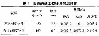 智能調溫紡織品的調溫機理與傳統保溫衣物有明顯不同:傳統衣物主要是利用空氣熱傳導率極小的特點,采用提高織物內部靜止空氣的方法來避免熱量散失的,其絕熱效果主要取決于織物的厚度和密度,且其保溫效果受外界壓縮和水分的影響;智能調溫紡織品利用其內部的相變材料來調節熱量而不是隔絕熱,是一種對水分和外界壓力影響不敏感的,能為人體提供舒適微氣候環境的全新保溫纖維.[3-4]B.PAUSE測試了普通紡織品的熱阻值和含有相變材料紡織品的熱阻值,結果如表1所示