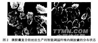 智能調溫纖維的研究于20世紀80年代起源于美國,主要應用于航空航天領域.Outlast腈綸基智能調溫纖維是采用包裹有相變材料石蠟烴的微膠囊,加入到腈綸紡絲液中所得,最初是太空總署為登月計劃而研發的,用作宇航員服裝和保護太空實驗精密儀器等,于1988年開發成功,1994年首次用于商業用途,1997年在戶外服裝中使用,現在已廣泛用于時裝和床上用品.[25-27]此后,Outlast公司與Kelheim纖維公司合作開發出Outlast粘膠纖維,并獲得專利.[28]其實就是將相變材料微膠囊加入到粘膠纖維的紡絲液中得到的,其隔熱效果達到42.5%,歐洲和日本也有這方面的研究.[29]德國最早研制成功硫酸鈉蓄熱微膠囊整理材料,之后,又開發了在中空纖維充入溶劑與隋性氣體的織物.日本東洋紡公司開發了以塑性晶體為芯材的鞘一芯復合絲.[1]1紡織工業南方測試中心通過熱分析法測出Outlast腈綸基智能調溫纖維中含有熱敏相變材料的吸熱、放熱性能:熔融吸熱溫度為24.0~32.0℃,熔融焓印染助劑28卷值為4.3J/g,結晶放熱溫度為23.5—19.5℃,結晶焓值為2.4J/g.東華大學通過電子顯微鏡也觀察到混入纖維的微膠囊分布狀態,從圖2可以清楚看到纖維中添加的微膠囊.Outlast公司試驗報告中還指出:如外界溫度在25~39clC變化時,具有Outlast纖維的服裝可以將溫度控制在30~35℃.