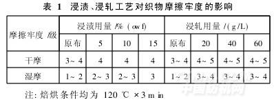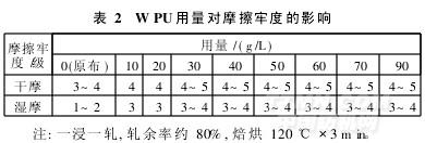 由表1可以看出,采用浸軋工藝處理的染色布,其濕摩擦牢度要高于采用浸漬工藝。采用浸漬整理的染色布,濕摩擦牢度最高只有3級,而采用浸軋工藝可以達到3~4級。其原因是,濕摩擦牢度提升劑WPU呈弱陽離子性,在浸漬過程中與纖維素陰離子的吸附力不強,當用量很少時,不能在纖維表面形成連續的膜,因此濕摩擦牢度相對比較低;要想達到較好的效果,只有增加WPU的用量。因此,以下試驗均采用浸軋法。