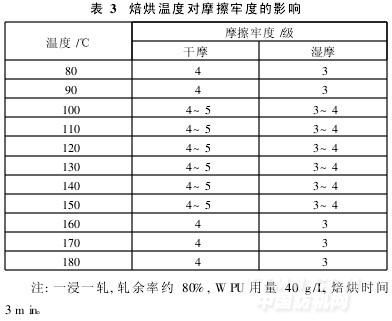 WPU必須在合適溫度下焙烘一定的時間,才能生成完整、致密的膜結構。時間太短,WPU大分子無法完全解封閉,或者無法完全與纖維素纖維的—OH、染料上的—OH、—NH2發生反應,導致濕摩擦牢度提高較少。