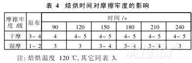 由表4可見,焙烘90 s,干摩擦牢度就從3~4級提高到4級,濕摩擦牢度從1~2級提高到3級;焙烘150~210 s,干摩擦牢度提高到4~5級,濕摩擦牢度提高到3~4級;但是焙烘240 s,濕摩擦牢度稍微降低。