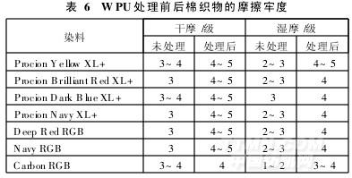 純棉白色斜紋機織布經下列幾種活性染料染色后,再用WPU按上述的工藝條件進行處理,測試處理后,織物的干、濕摩擦牢度如表6所示。