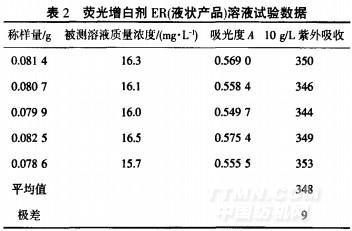 通常用于紡織印染行業的熒光增白劑ER產品有液狀和粉狀(配有分散劑等助劑),其紫外吸收約為熒光增白劑ER(原粉)的1/5,熒光增白劑ER(液狀產品)溶液數據見表2.
