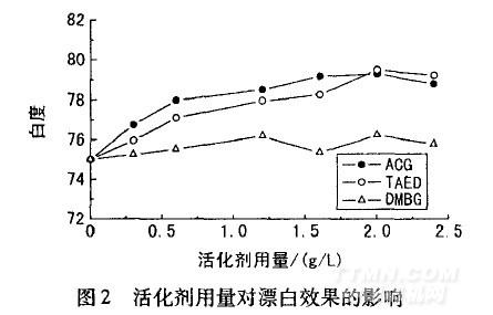 由圖2知,三種漂白活化劑的漂白效果依次為ACG>TAED>DMBG,這與圖1的結(jié)論一致。由圖2還可以看出,隨著DMBG用量的增加,漂白織物的白度并沒(méi)有明顯的提高,且織物白度也不高,因此并不適合作為棉織物雙氧水低溫漂白活化劑。比較ACG和TAED,隨著兩者用量的增加,漂白后織物的白度逐漸提高,當(dāng)ACG用量達(dá)到1.6g/L時(shí),再增加其用量,白度提高不很明顯。這是因?yàn)楫?dāng)ACG用量達(dá)到1.6g/L時(shí),吸附在棉纖維表面的乙酰胍陽(yáng)離子已達(dá)飽和,再進(jìn)一步增加乙酰胍用量,對(duì)漂白白度影響不大。