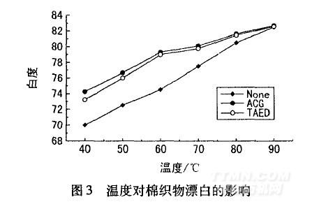 采用ACG和TAED作為棉織物雙氧水漂白活化劑,測(cè)試了不同溫度下織物的白度,結(jié)果如圖3所示。