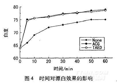 由圖3可以看出,在較低的溫度范圍內(nèi)(40—6O℃),隨著漂白溫度的升高,織物白度迅速提高;當(dāng)溫度達(dá)到6OqC時(shí),進(jìn)一步提高溫度,織物白度增加的幅度減緩。這一規(guī)律正好符合低溫漂白的要求,從節(jié)約能耗方面考慮,可選擇6O℃作為漂白溫度。