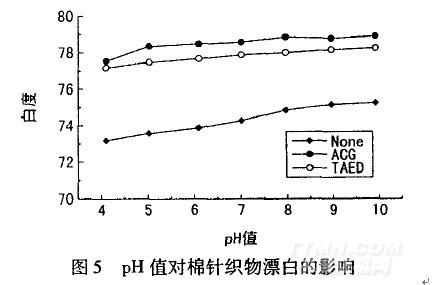 由圖5可知,在pH值4—10的范圍內(nèi),隨著pH值的升高,織物的白度逐漸提高,且在堿性條件下白度最高。這是因?yàn)閷?duì)于雙氧7J~,/ACG活化體系,堿性條件更有利于乙酰胍陽離子的生成;對(duì)于雙氧7J~/TAED活化體系而言,在堿性條件下雙氧水分解產(chǎn)生的質(zhì)子被堿中和,從而加速了雙氧水分解反應(yīng)的速率,有利于TAED與HOO一反應(yīng)生成過乙酸。但是,pH值過高,雙氧水和乙酰胍陽離子存在穩(wěn)定性差的缺點(diǎn)。從多方面考慮,棉織物雙氧水/ACG活化體系漂白pH值可選取8左右。