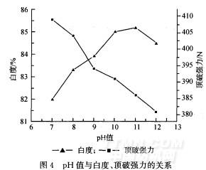 由圖4可知,隨著pH值升高織物的白度增加,pH值在11左右達到最佳水平,繼續提高pH值,織物的白度反而下降。這是因為在強堿條件下雙氧水反應非常快,氧分子從漂液中逸出,不僅降低了漂白效果,而且形成的中間體很活潑,容易損傷纖維。隨著pH值升高織物的頂破強力下降。為了減小pH值增大對強力的影響,獲得較好的漂白效果,要控制漂液pH值在10左右。