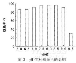 由圖2看出,皂洗酶pH值的應用范圍較寬, pH值為7~9時,脫色率最好,接近100%; pH值為6~7時,脫色率能達到80%以上; pH值超過9,脫色率下降很快,說明大部分酶已失活。因此, pH值宜選用7~9。