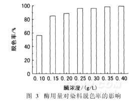 由圖3可見,在一定的染料濃度條件下,酶用量越高,脫色率越高;酶用量增至0. 35 g/L時,對染料脫色率已接近100%。綜合考慮生產成本,對于雷馬素藍RGB,確定酶用量為0. 25 g/L,酶與染料質量比約為25∶1。
