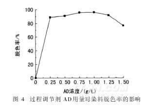 皂洗酶在使用過程中需要過程調節劑的協同作用。其它條件同上,考查了不同調節劑AD用量對染料脫色的影響,結果見圖4。