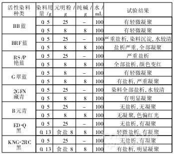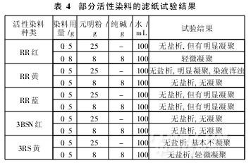 ②在副缸中采用大浴比化堿,與主缸形成循環(huán)。根據(jù)經(jīng)驗,染料的水解率分別是:二氯均三嗪類在40%左右;雙一氯均三嗪類近20%,個別超過30%;雙乙烯砜類、單乙烯砜類和異雙類(一氯均三嗪+乙烯砜)大部分在20%。部分活性染料在濾紙上的凝聚、鹽析、水解試驗結果見表4。