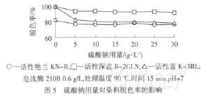 從圖10可以看出,硫酸鈉用量對皂洗效率有一定的影響,考慮到試驗誤差等因素,可以認為皂洗過程中皂洗酶對低用量硫酸鈉不是很敏感.