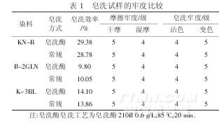 由表1可知,用皂洗酶皂洗的織物各項色牢度均與常規皂洗工藝一致.