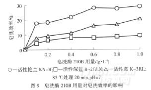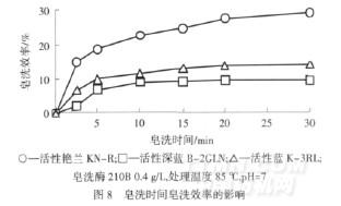 由圖9可知,活性深藍B-2GLN在較低的皂洗酶210B用量(0.4 g/L)下,皂洗效率基本達到了平衡.而活性藍K-3RL和活性艷蘭KN-R在皂洗酶210B用量分別為1.0 g/L、0.6 g/L時,才具有較高的皂洗效率.