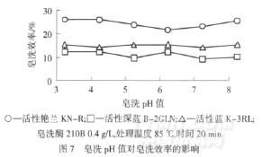 由圖6可知,當皂洗溫度為65℃時,皂洗酶210B對染色織物具有一定的皂洗效果,隨著處理溫度的升高,皂洗效率逐漸增強;85℃時,活性艷藍KN-R、活性藍K-3RL染色織物基本達到皂洗平衡.活性深藍B-2GLN>85℃皂洗時,皂洗效率略有提高,從能耗等方面綜合考慮,皂洗溫度選擇85℃.