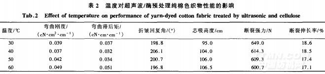 處理?xiàng)l件:超聲波40kHz,酶用量2.5%(0.W.f),浴比1:20,pH=4.5,溫度分別為30、40、50、60℃,處理50rain,然后將試樣晾干,充分調(diào)濕后進(jìn)行柔軟整理。結(jié)果如表2所示。