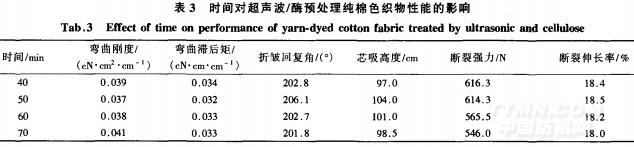 處理?xiàng)l件:超聲波40kHz,酶用量2.5%(0.W.f),浴比1:20,pH=4.5,溫度40℃,處理時(shí)間分別為40、50、60、70min,然后將試樣晾干,充分調(diào)濕后進(jìn)行柔軟整理。結(jié)果如表3所示。