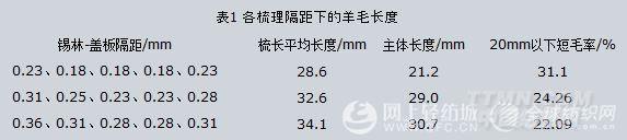 紡紗過程中纖維損傷主要是由于梳理機梳理。對90支澳毛條(切斷長度為60mm)做對比試驗,在最終梳理效果基本不變的前提下,不同隔距和速比,梳后羊毛平均長度最多可相差5.5mm,2mm以下的短毛率可相差9.01%,實驗結(jié)果見表1。