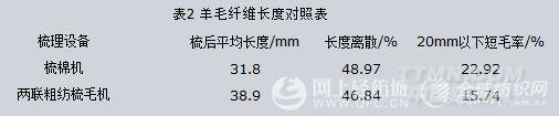 其他需進一步研究探討的設(shè)備包括:①毛條拉斷機取代切斷機。現(xiàn)在半精紡廠普遍使用的羊毛為切斷的毛條,切斷毛條在降低羊毛長度的同時,也使短毛率大大增加。為了能既降低羊毛長度又避免人為造成的短毛增加,正同設(shè)備人員探討以毛條拉斷機代替切斷機,只將超長纖維拉斷,避開切斷機長短纖維一刀切的缺陷,如果這一思路實現(xiàn),將大大降低因毛條切斷增加的短毛率。②梳理機的改造。由于梳棉機錫林使用的是剛性鋸齒針布,在加強梳理作用的同時,也增加了對纖維的損傷,一道梳棉機梳理對纖維的損傷,甚至超過了兩聯(lián)粗紡梳毛機的彈性針布的損傷。表2為2種設(shè)備梳理后70支澳短條(平均長度58mm)纖維長度對照表。