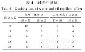 試驗(yàn)結(jié)果表明,織物經(jīng)等離子體處理后,再對其進(jìn)行拒水拒油整理,可以使織物具有更佳的拒水拒油性能。