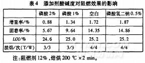阻燃劑原液呈酸性,其整理液的酸堿性會影響阻燃效果。為此加入不同量的磷酸和磷酸二氫鈉,測試其阻燃效果,結果見表4。