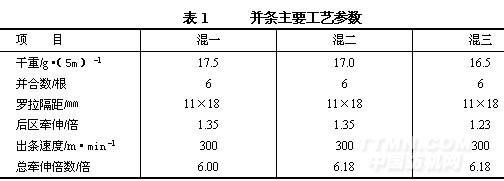 為了使兩種纖維充分混和,采用三道并條,因兩種纖維長度差異較大,隔距應(yīng)合理控制。玉米纖維回潮率低、易起靜電、纖維蓬松,因此張力控制要適當(dāng),喇叭口不能太小,以減少不必要的意外牽伸,牽伸分配要合理,保證在牽伸過程中對(duì)纖維的有效控制,以提高條干均勻度。由于棕色棉纖維本身的原因,膠輥容易吸花,因此應(yīng)選擇合理的涂料對(duì)膠輥進(jìn)行處理,車速應(yīng)偏低掌握,通道要光潔,保持絨板的運(yùn)轉(zhuǎn)良好,減少壓力棒的短絨積聚,做好紗疵的控制工作。并條工序主要工藝參數(shù)見表1。
