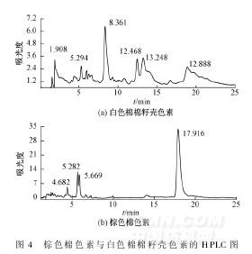 棕色棉色素與白色棉棉籽殼色素的HPLC分離結果如圖4所示。由圖可知,白色棉棉籽殼色素提取物所含成分較多,其中保留時間為8.361min的組分含量較高。天然棕色棉色素提取物主要含有4種成分,其中保留時間分別為5.282、5.669min的組分未完全分離,可能是其分子結構十分相似的緣故,其HPLC分離條件也需進一步摸索。保留時間為17.916min的組分在棕色棉色素混合物中占有相當大的比例,而且分離度很高。雖然2種色素為同一類化合物,但從它們的HPLC色譜圖可看出,天然棕色棉色素和白色棉棉籽殼色素并沒有分子結構完全一致的組分。