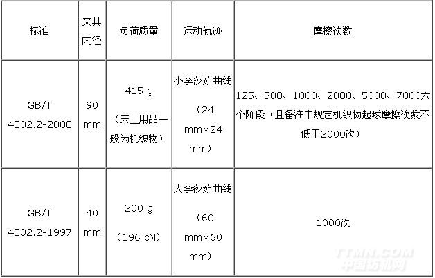 從表6中可知,GB/T 4802.2的新標準無論從夾具內徑、負荷質量、運動軌跡還是摩擦次數均有較大變化。新標準中起球評級階段有六個階段可選,且上述三個床上用品的產品標準中起球次數均未指定,所以按2008年版新標準無法進行實驗考核。而如果摩擦起球次數參照1997年版舊標準選擇1000次,由于試樣夾具面積不同造成的試樣與磨料的接觸面積不同,同時負荷質量和運動曲線也不同,因而實驗結果也是沒有可比性的,產品標準中的考核指標失去了意義。所以2008年版新標準代替1997年版舊標準后一些產品標準的起球無法考核。建議對這些產品標準進行改進。
