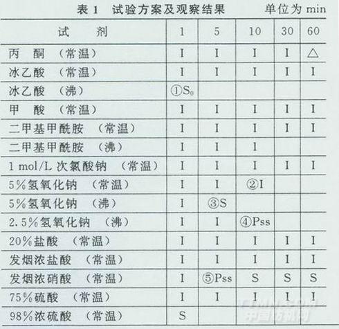 從實驗室樣品中任意抽取試驗樣品,按1 g試樣100 mL。溶劑的比例分別放進盛有表1所列的溶劑的燒杯中。視溶解的情況,分別攪拌或煮沸1、5、10 min……后靜置幾秒鐘,觀察結果詳見表1。